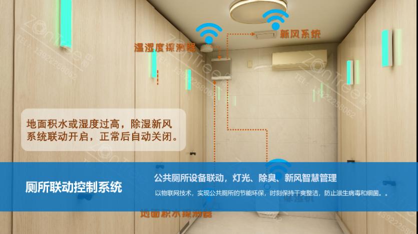 厕所联动控制管理系统——可实现1、灯光控制:光照传感器和红外人体探测器联动控制灯光,实现天黑灯亮、天光灯灭,人来灯开、人走灯灭的功能;2、除臭排风控制:当臭气超标自动开启通风设备及香薰机;3、温度自动调节:当公共厕所室内温度过高时,可自动开启空调系统;4、当地面湿滑有积水,可自动开启除湿机及排风机。从而实现公共厕所的节能环保,时刻保持干爽整洁,防止滋生病毒和细菌。主要设备由臭气监测器、光照度探测器、人体感应器等条件触发设备和联动控制箱、管理系统平台等组成。(作者原创,侵权必究)