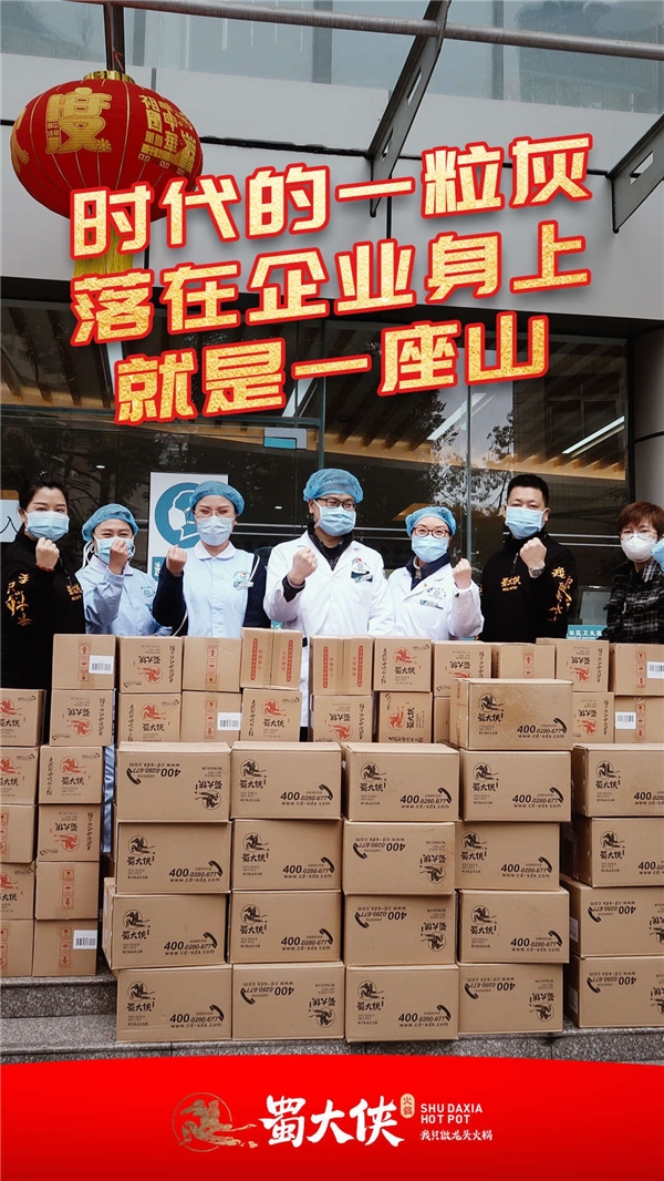 蜀大侠诞生在有着侠义文化底蕴的成都,在成都秉持着侠义精神打造味蕾武林。蜀大侠面对疫情时艰,方显英雄本色。疫情期间蜀大侠启动“慰问一线爱心物资”驰援项目,在元宵佳节当天,为包括街道办事处、社区服务站、区卫生站、派出所等单位送出2400余盒免费爱心方便火锅,同时捐献善款5万元心系抗疫。向医院、街道办、新闻媒体的一线英雄们送出方便火锅、矿泉水、午餐肉等方便卫生的食物,两批爱心物资共计十万余元,通过线上平台赠送了价值500万的双人套餐。2月29日蜀大侠通过官方微信公众号准备了两千万感恩基金向成都无数奋战一线的医疗机构医务人员致敬,成都医疗机构的医务人员凭借国家卫健委官网医师证件截图即可领价值189元的“白衣天使加油券”。蜀大侠用行动诠释了成都火锅企业的责任担当和大侠风范,回报社会,彰显大爱,为英雄们助力!