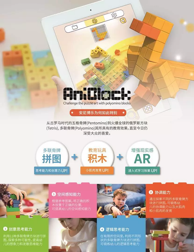 在本次展会上,Pacoware带来了全新的安尼博乐(AniBlock)积木产品。安尼博乐是应用11种形状的多联骨牌积木的艺术拼图游戏,配有ABS材质积木,专用积木地板和图纸。玩家可以参考图纸,通过多种多样的方法找出答案。不仅如此,安尼博乐还可以通过AR指导和AR再现进行线上联动游戏。它是一款充满趣味,同时具有多种教育价值的创意游戏教具。