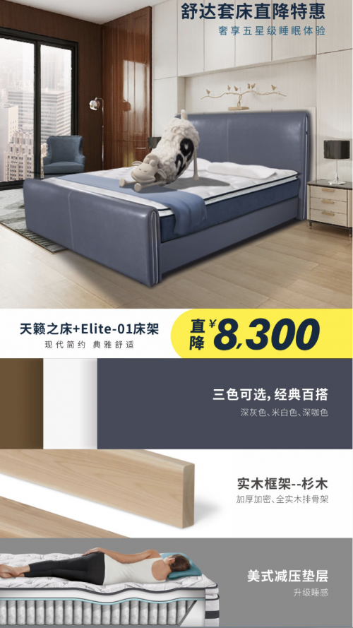 天籁套床(天籁之床+菁英Elite-01床架),典雅舒适型。天籁之床运用舒达三大核心技术:舒柔绗缝层:提供柔软保护,分散身体重量,缓解身体压力,提高贴身度和舒适度。妙而扣弹簧:均匀释放身体压力,提供平衡支撑,带来健康睡眠。边缘加固系统:加强边缘承托,减少边缘下陷,扩大床垫使用面积。