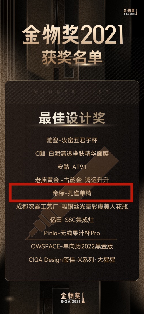 凭借卓越的产品品质、突出的设计能力以及良好的市场口碑,帝标孔雀椅在激烈的竞争中脱颖而出,成功斩获金物奖最佳设计奖,充分展现了帝标家居设计力、产品力及品牌影响力,又一次在新国货的竞技场上破圈而出。